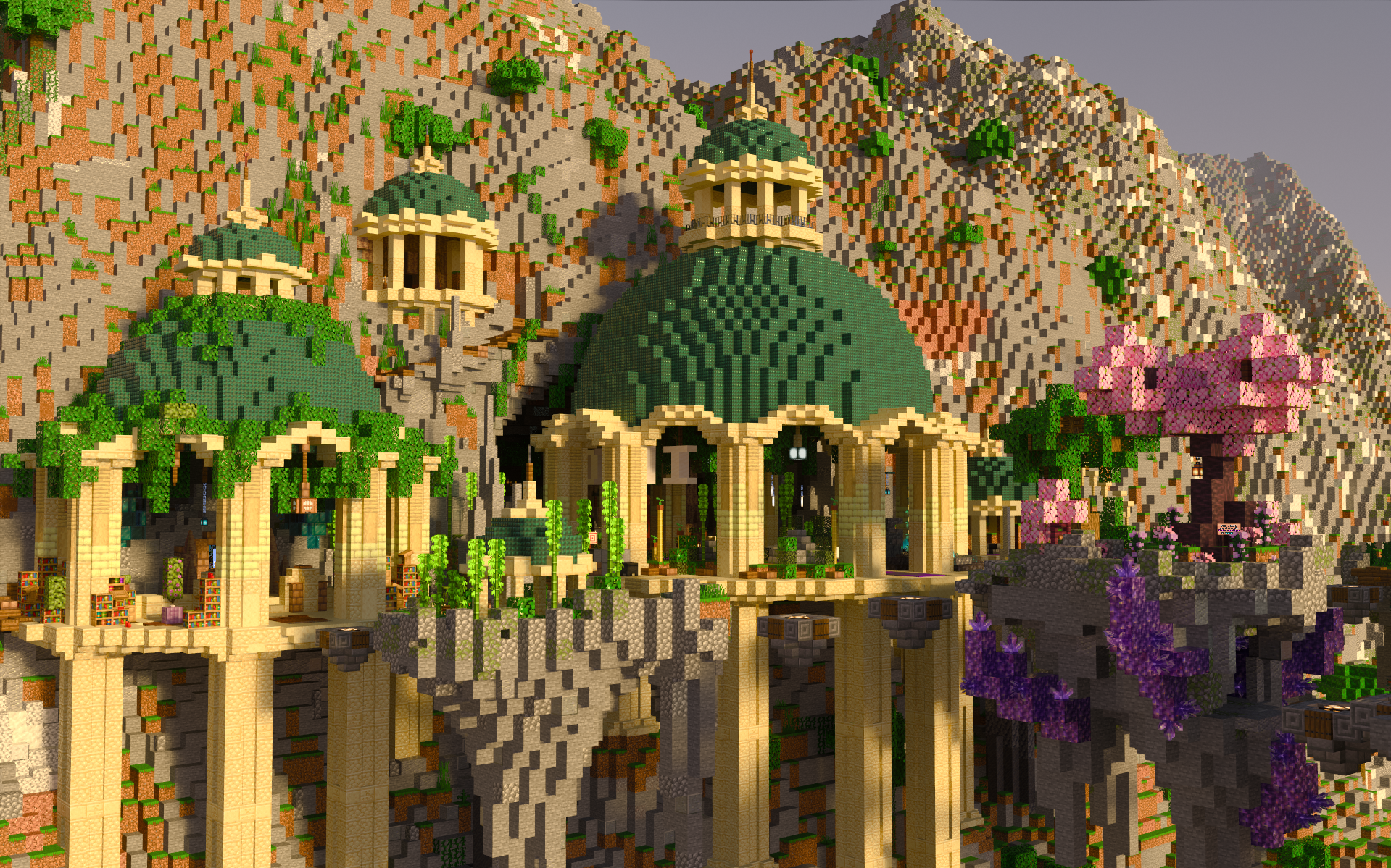 Our Realm's Lobby is a vast and feature-rich hub, designed to accommodate everything a Realm or Server Lobby could need. Used throughout 2024 in our Realm, this lobby is built around massive domes on the side of a towering mountain, with an intricate cave system and a fiery volcano housing many of its key features. It includes Shops, Loot Crates, Guilds, an Info Center, Minigame Selection, Sky Islands, Parkour Features, and much more!